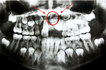 *This panoramic x–ray shows an impacted central incisor which is dilacerated or has a bent root that needs to be surgically and orthodontically pulled out.