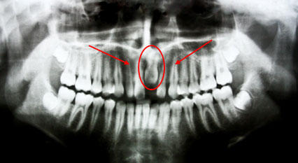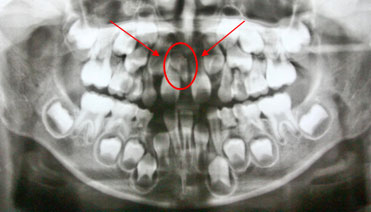 *This is a panoramic x–ray of a six–year old patient with an extra inverted tooth which was surgically removed to close the gap of the incisor.